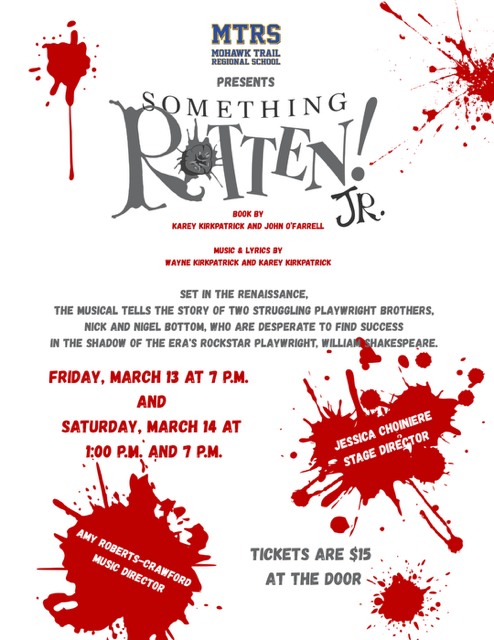 The spring musical at Mohawk Trail Regional School will be Something Rotten Jr., an entertaining combination of 16th=century drama and 21st=century musical comedy. The plot revolves around two brothers, aspiring playwrights living in the shadow of William Shakespeare, who end up creating the world’s first musical comedy. The show is fun and family-friendly … and it stars Hawley’s own Landon Clark.